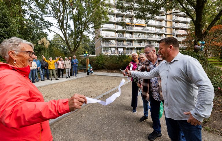 Wethouder Henk van Os heropende donderdag 2 oktober de jeu-de-boulesbaan aan het Seringenplantsoen. Het parkje en de baan achter de flats zijn pas helemaal opgeknapt.