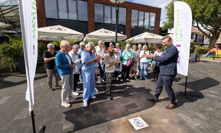 Burgemeester Marco Oosterwijk legde dinsdag 26 augustus samen met leden van Vrouwen van Nu een stoeptegel op het Sint Jorisplein. Op de tegel staat de tekst: ‘Hier begint de zee, niets ingooien a.u.b.’.